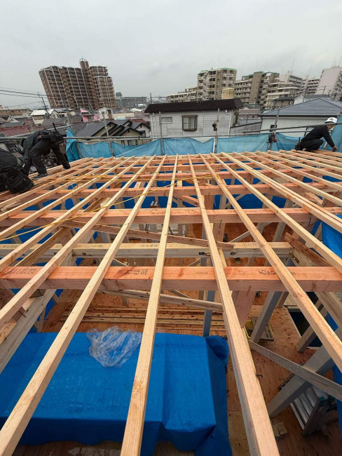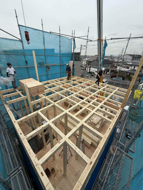 2025.04.02 工事 O様邸 上棟 先日、堺市内にてO様邸の上棟を迎えました✨✨朝早くから、チーム一丸となって作業が行われます。大きく形が変わる上棟日は、何度みても感動します👏😌3階建てのO様邸✨これからの経過が楽しみです🌈